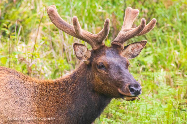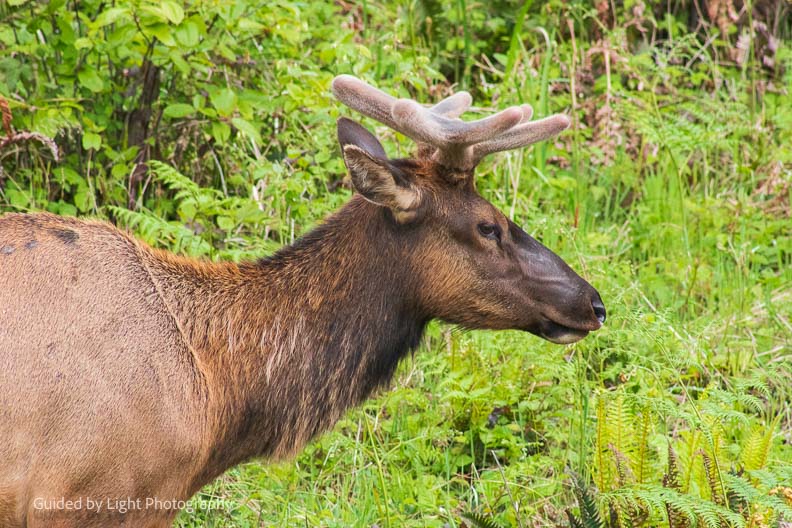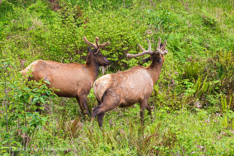 As soon as I drove into the park along Drury Parkway, a small gang of Roosevelt elk were grazing right next to the road! New antlers are growing in, last time I saw elk, several had just shed their antlers.