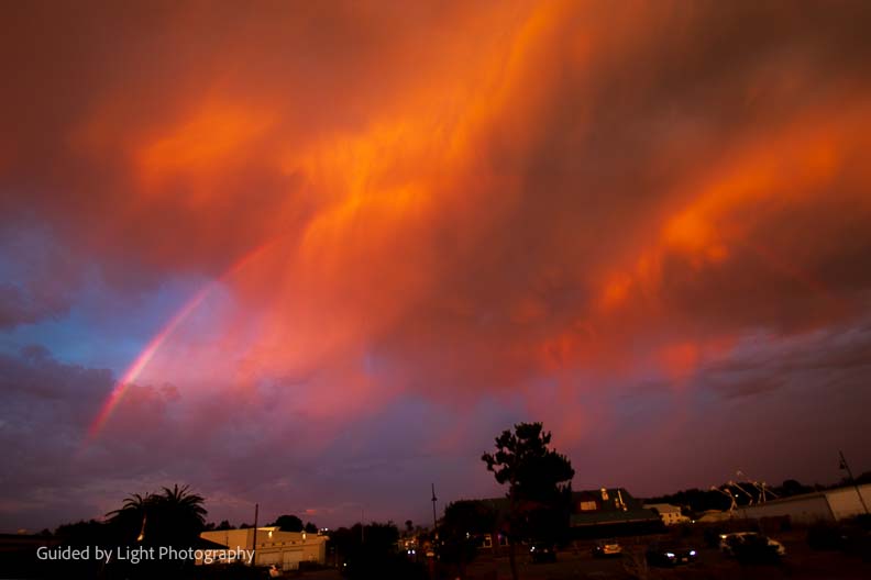 The sun was already dropping behind the marine layer when we arrived, but looking back east, there was a stunning rainbow, wreathed in fiery red clouds (possibly smoke from the fires in Maui?)