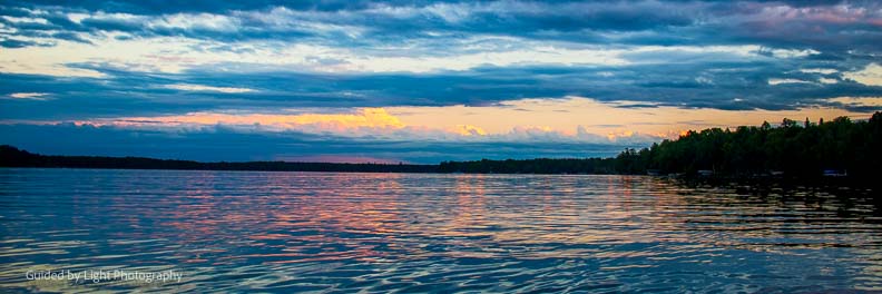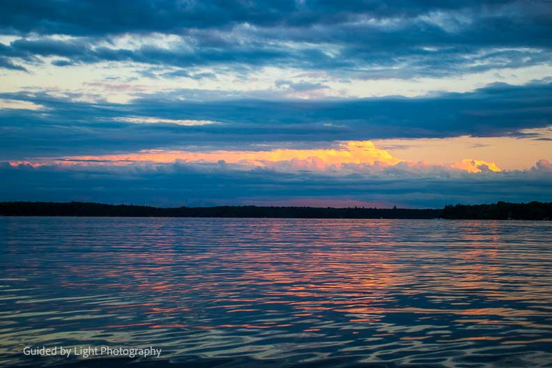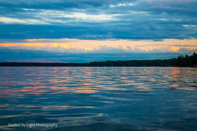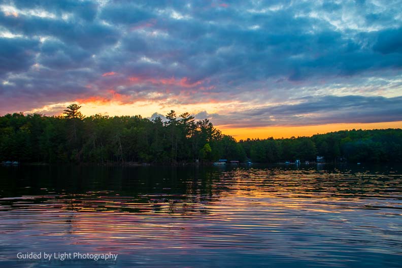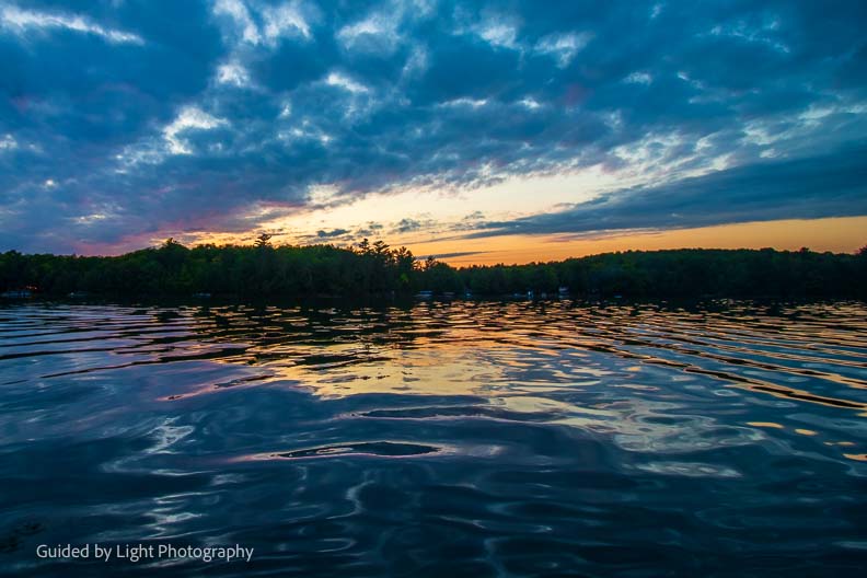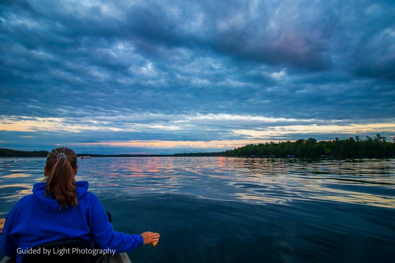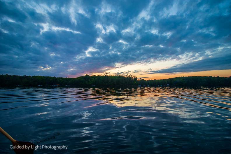 After the beautiful rainbow, the clouds stuck around and set the stage for a beautiful sunset. Jenn and I paddled out in a canoe to bask in the beauty ๐